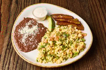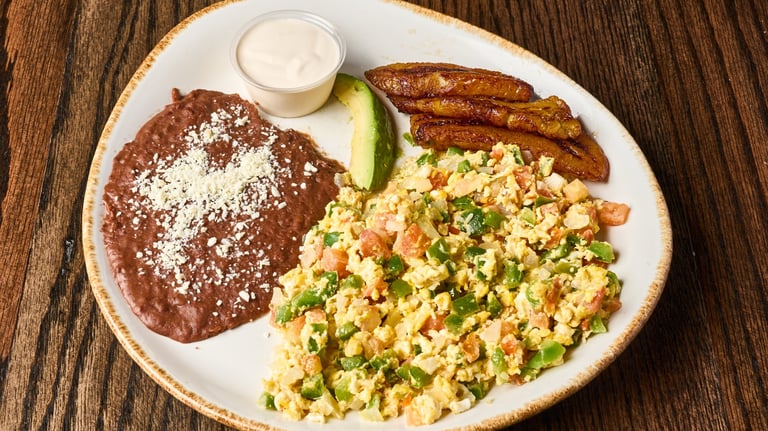 Served with 2 eggs any style, plantain, beans, avocado and cream.