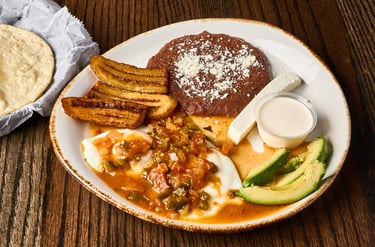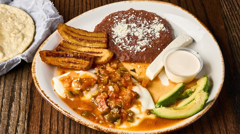Huevos Rancheros Served with Beans, Plantain and Cream